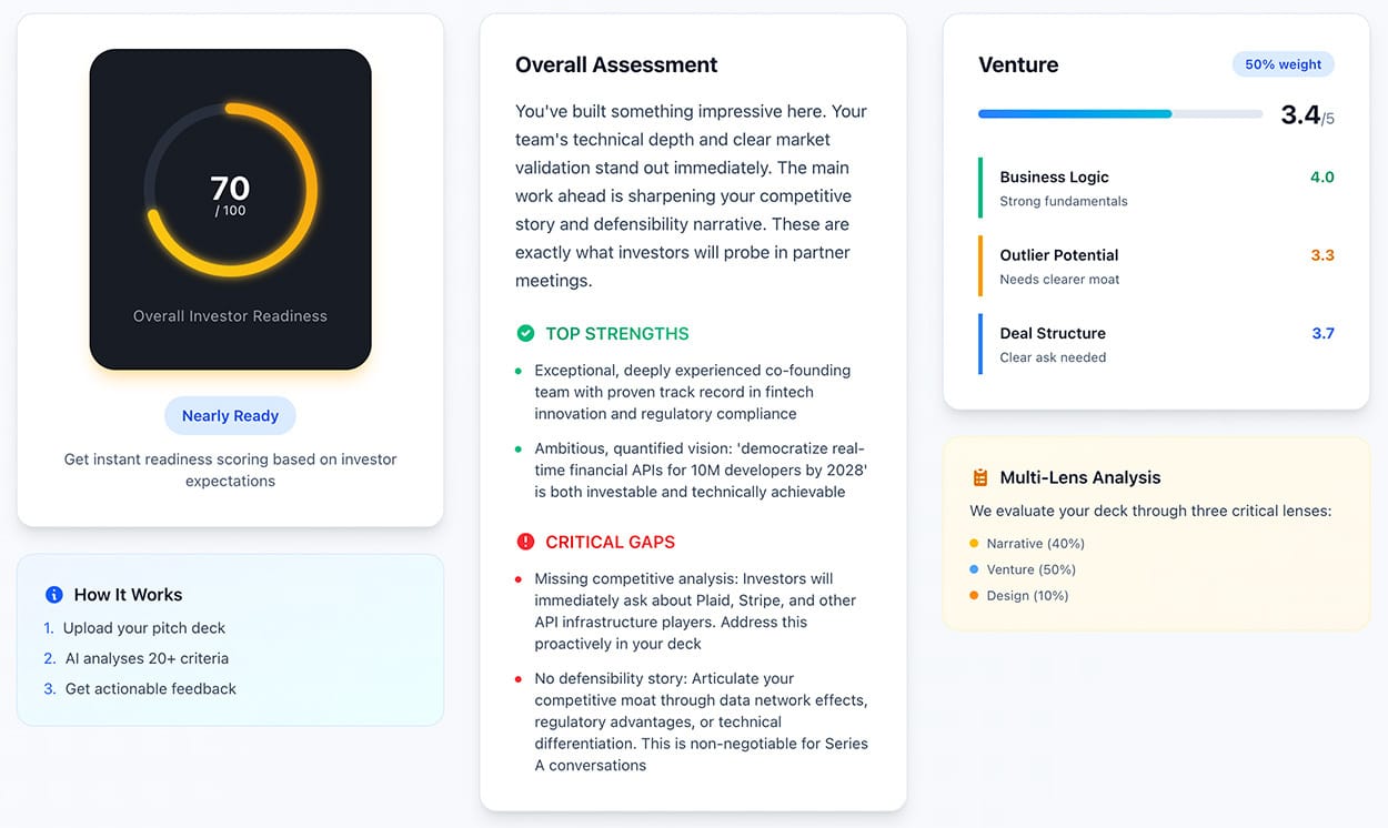 The feedback is broken down into three broad categories. Firstly, the narrative of the deck. Is this a compelling story? At seed and pre-seed, maybe potentially up to series A, the story really matters. Then we look at the venture fundamentals. Is this a scalable venture opportunity that VCs would be excited about? And then we also look at design.